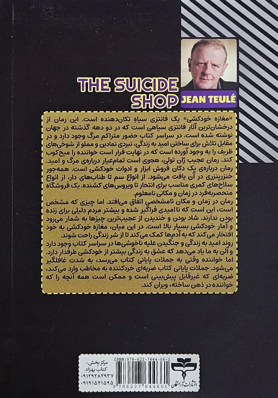 کتاب مغازه خودکشی اثر ژان تولی، رمانی متفاوت، طنزآمیز و فلسفی است که با نگاهی کنایه‌آلود، به مفاهیمی چون ناامیدی، شادی و انتخاب انسان در زندگی می‌پردازد. این اثر با ترجمه زهرا بختیاری و از سوی انتشارات آراستگان با جلد شومیز منتشر شده است.
