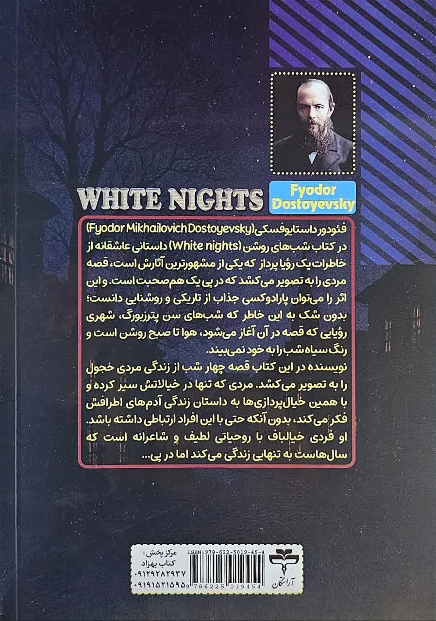 کتاب شبهای روشن اثر کلاسیک فئودور داستایفسکی، رمانی کوتاه و شاعرانه است که با نگاهی عمیق به احساسات انسانی، تنهایی، عشق و امید، خواننده را با دنیای درون شخصیتها آشنا میکند. این اثر با ترجمه لیلا دژالون و از سوی انتشارات آراستگان با جلد شومیز منتشر شده است.
